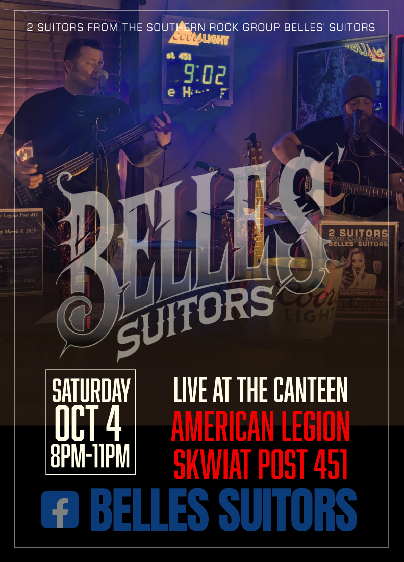 Thursday, June 5, 2025 BellesSuitors LiveMusic MichiganCityIN AmericanLegion SkwiatPost451 TheCanteen July19Event RockShow LocalBands SupportLocalMusic saicmarktag Mark Taglianetti Jeremy Burns Dan Vahary Colin Biege michigan city portage indiana