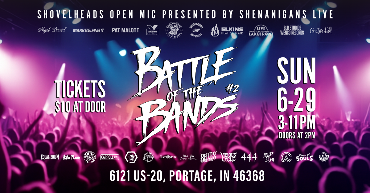 Wednesday, June 4, 2025 BattleOfTheBands Shovelheads LiveMusic ChestertonIN IndianaMusicScene LocalBands FreeEvent RockShow MusicCompetition AcousticSet SupportLocalMusic BellesSuitors ViciousCycle CircusOfSouls 444Band ChasingAllura HaloMoon EquilibriumBand OutOfTheFog PlatiPossum CarrollAve SinsOfThePit ExpulsionNWI NellieBly BlalockOrchard saicmarktag Mark Taglianetti Jeremy Burns Dan Vahary Colin Biege michigan city portage indiana